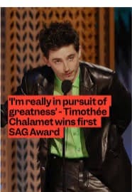 Timothée Chalamet came close, but no Oscar cigar for playing the young Bob Dylan in “A Complete Unknown.” Some claim he displayed hubris overload in accepting The Actor prize from the Screen Actors Guild, which made him the youngest to do so in the category. "I know we’re in a subjective business,” said the then 27-year-old, “but the truth is, I’m really in pursuit of greatness. I know people don’t usually talk like that, but I want to be one of the greats. I’m inspired by the greats. I’m inspired by the greats here tonight. I’m as inspired by Daniel Day-Lewis, Marlon Brando and Viola Davis as I am by Michael Jordan, Michael Phelps, and I want to be up there. So I’m deeply grateful. This doesn’t signify that, but it’s a little more fuel. It’s a little more ammo to keep going. Thank you so much.”