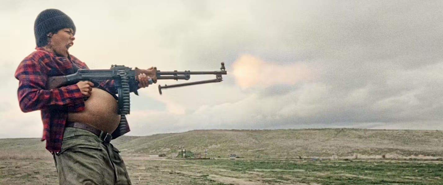 The film’s bracing blend of giggles and gravitas is distilled in the image of a very pregnant Perfida fiercely firing an AK-47. Taylor’s gut-punch of a performance cuts right to the core of the film’s take on the threat of violence on family.